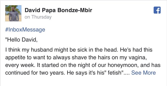 “I think my husband might be sick in the head. He’s had this appetite to want to always shave the hairs on my vajay, every week.